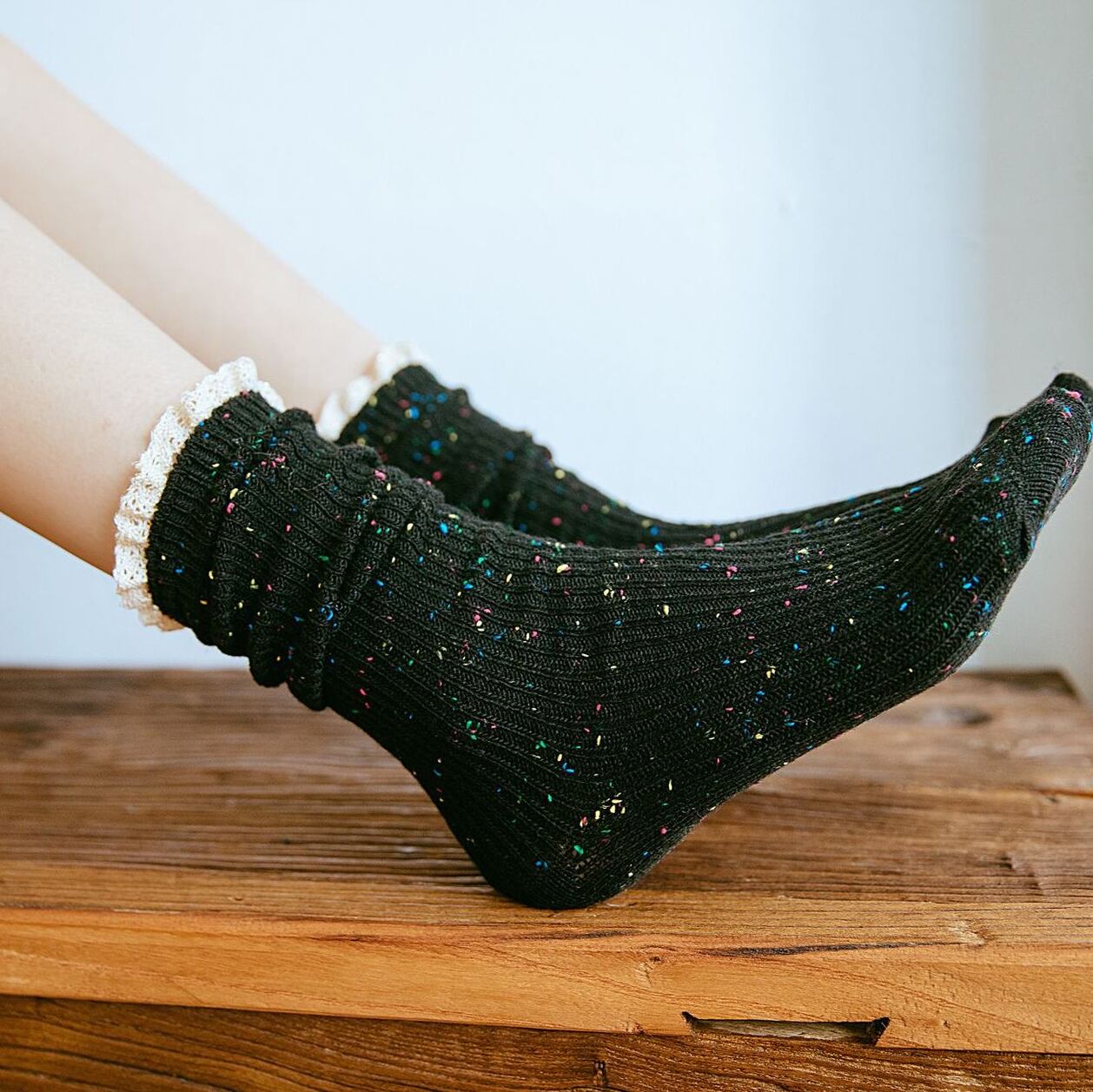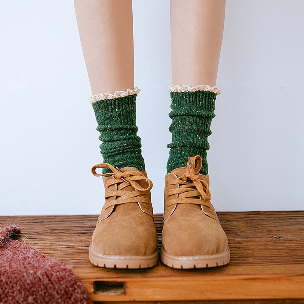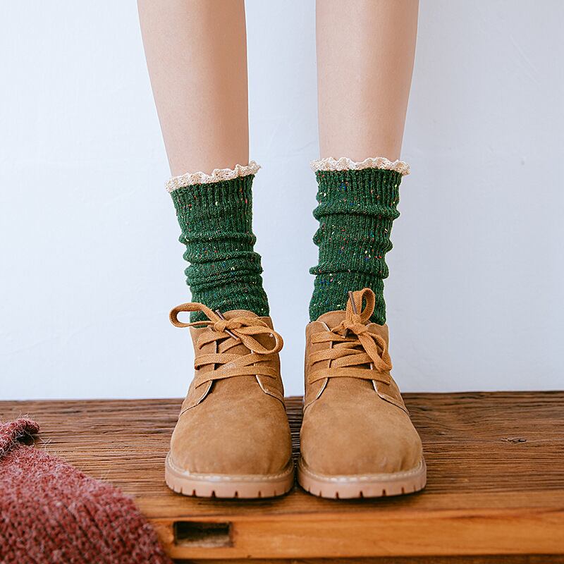 厚手で暖かく、履き口にはレースが施してあり、足元を華やかに演出してくれます。