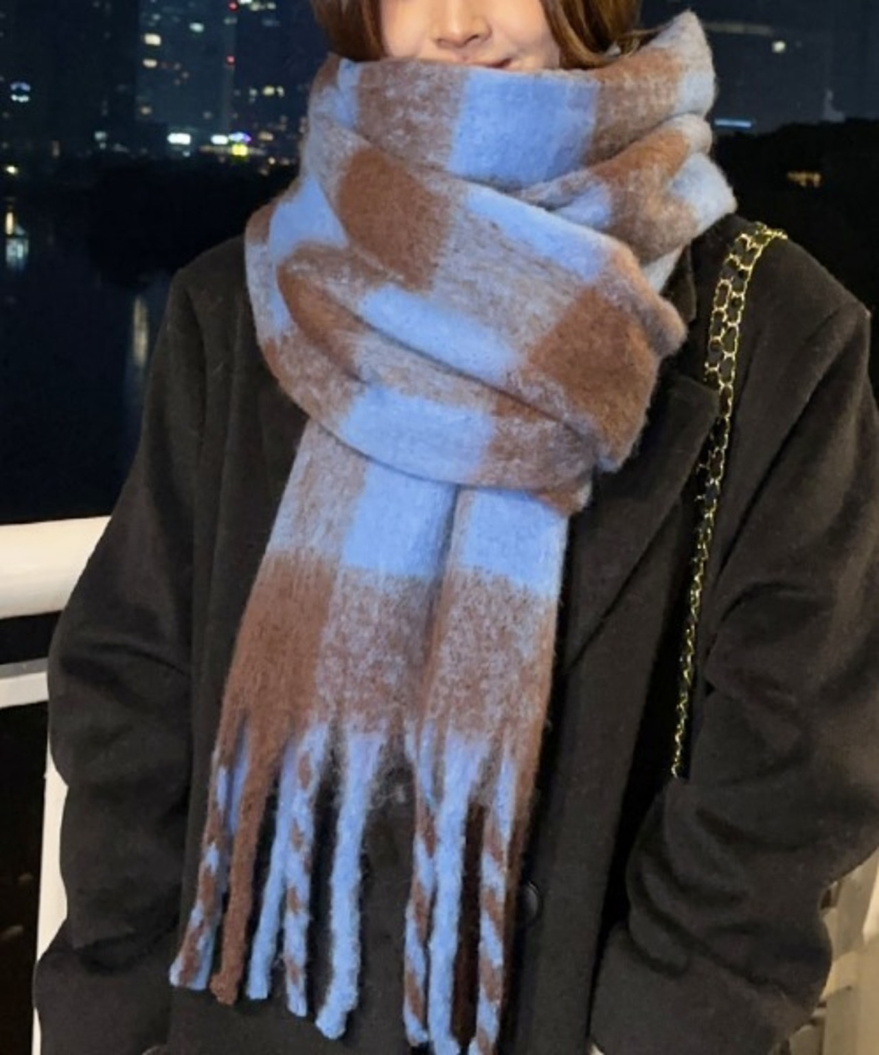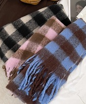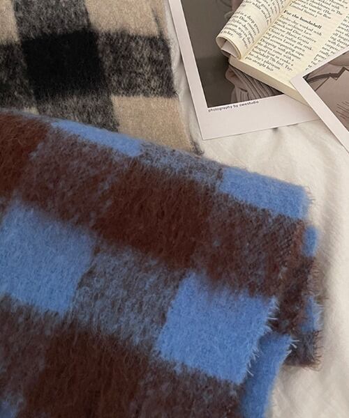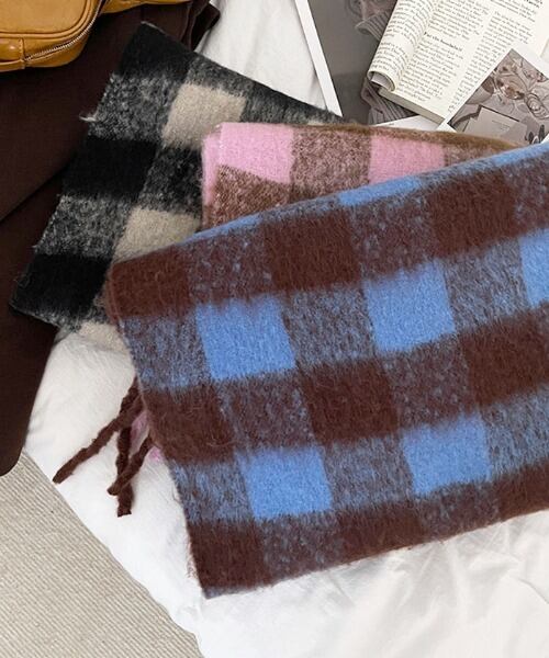 シンプルで優しい色味のチェック柄は、コーディネートも選びやすく、ボリューム感があるので顔まわりにふわっと巻けば小顔効果も抜群!