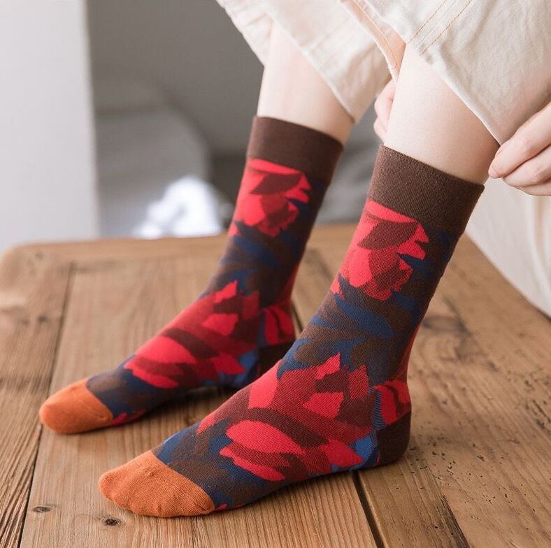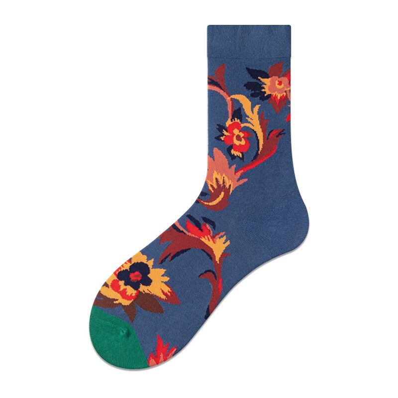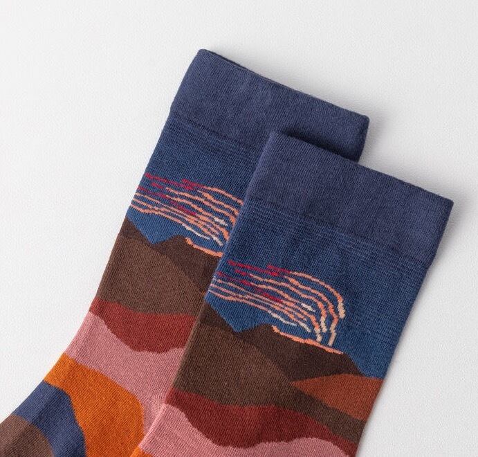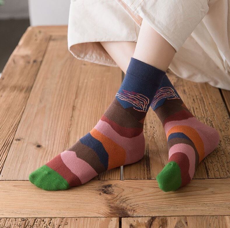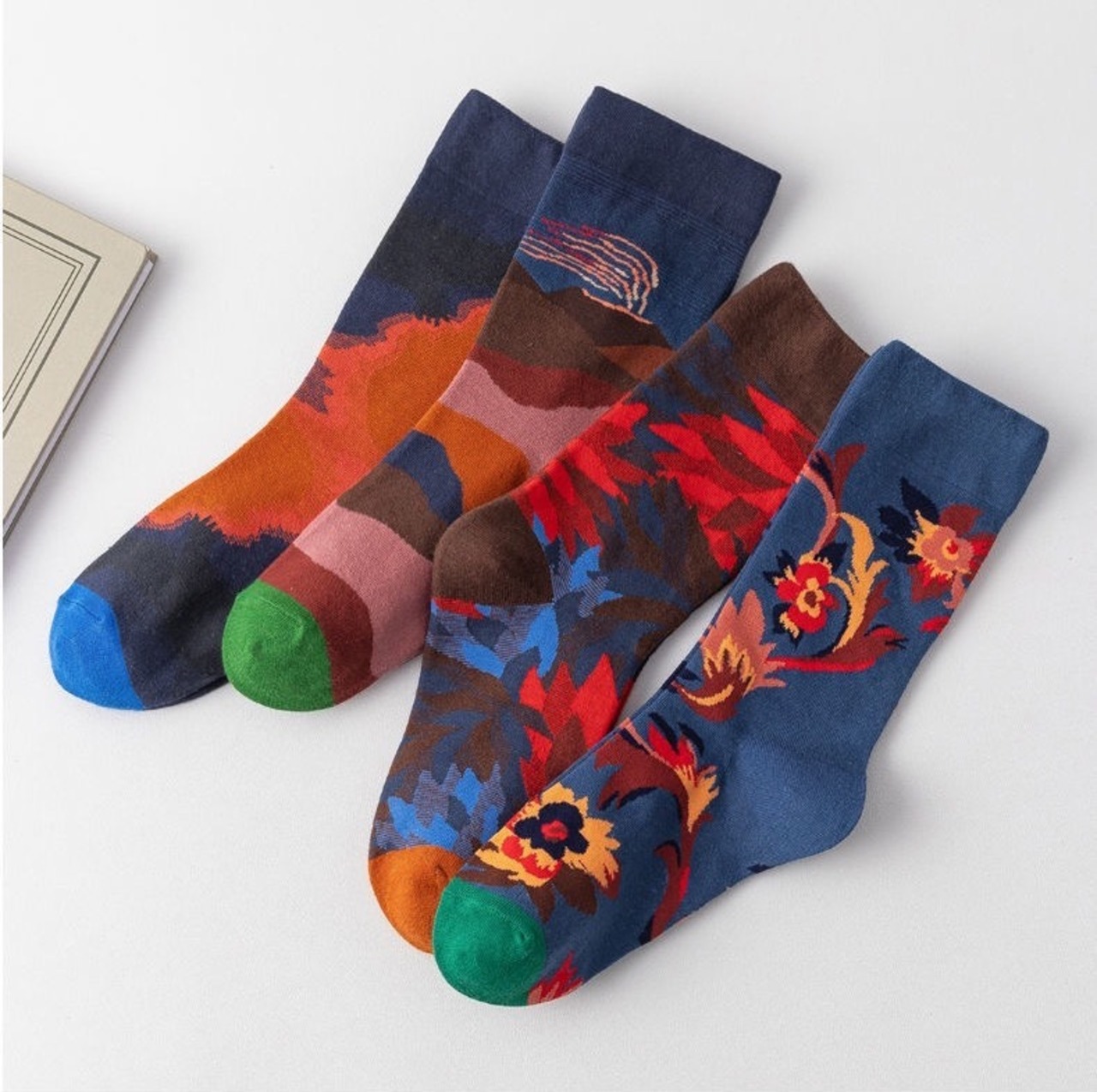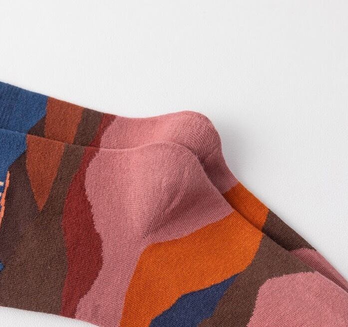 落ち着いたカラーながら色使いが鮮やかでニュアンス豊かな絵画を思わせるデザインのカジュアル靴下です。