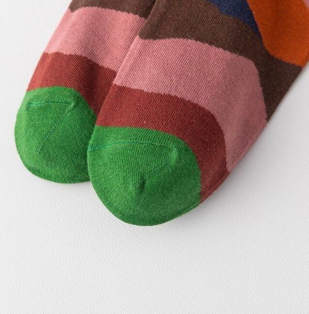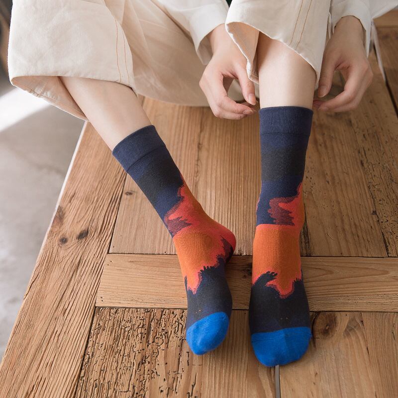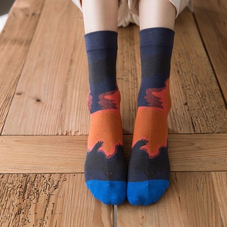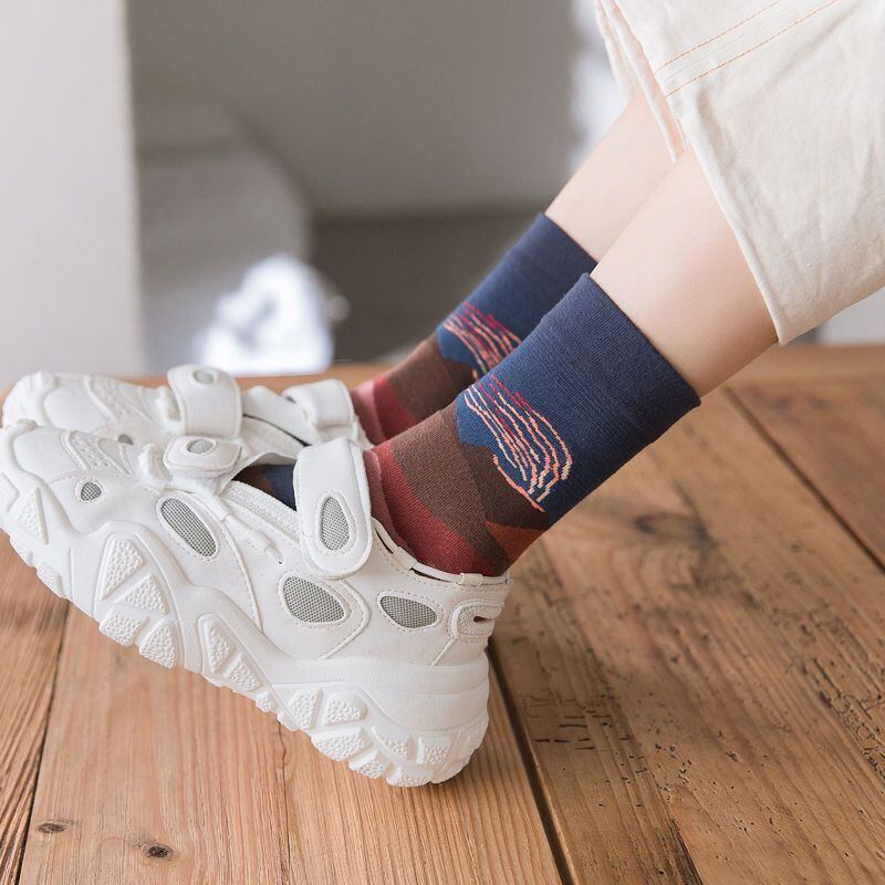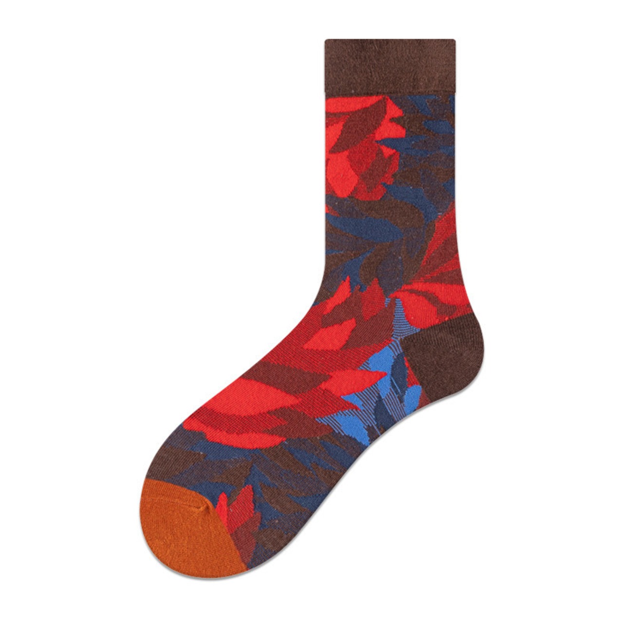 落ち着いたカラーながら色使いが鮮やかでニュアンス豊かな絵画を思わせるデザインのカジュアル靴下です。